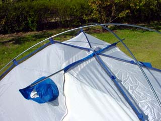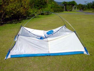 テント本体にフライシートをかぶせる.フライシートには,防水加工がされている.これで,4シーズン使用できる.積雪期用に,フライシートに変えて,外張りもある. |