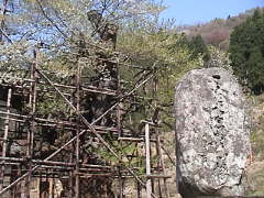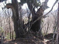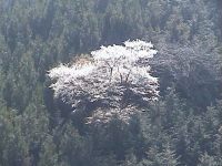 ちょとした登山道らしき道を登って行くと、かつてはクワ畑だったらしい段々畑の中に大きなサクラが現れる。
