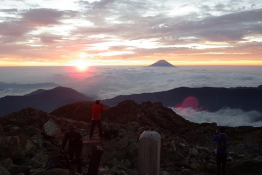 悪沢岳山頂で朝日の撮影に没頭する私 |