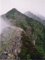 頂上からの景色は昨日とは雲泥の差で穂高連峰や表、裏銀座の山々が雲の中に見え隠れしていた。去年登った常念岳や蝶ヶ岳もここからは遥か下に見えた。