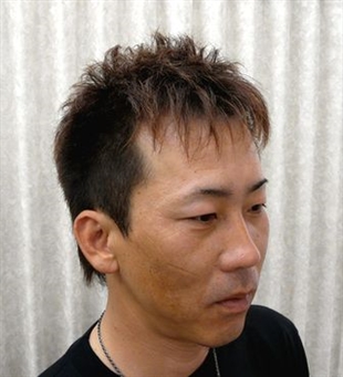 いつものソフトモヒカン系のショートスタイルから、少し長めのアレンジ。サイドを厚めに刈り上げ、トップはスライドカットでボリュームと空気感を演出。アラフォー世代ながら、断然若返りました。普段はハードムースを付けていますが、今回はワックス(フィクスワックス)をつけて束感を作りました。みごとななモテ髪になりました。