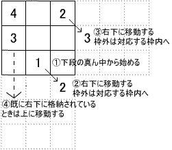 奇数の魔方陣(3,5,7,9,11,...)は全て以下の方法で作成することができます。