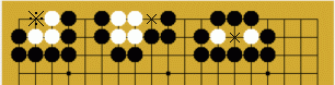 黒石が*に打たれると、白石は周囲を囲まれて活力が無くなり打ち上げられます。(左の図)