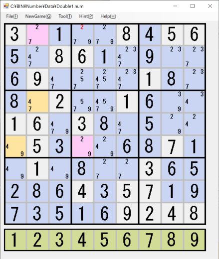 // Hint から候補が一個のマスを調べる(赤色で表示)