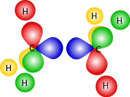 2つの炭素原子のそれぞれに,sp2 混成軌道を適用する.炭素原子のsp2 混成軌道のうち,向かい合う2つが,σ結合を作り,炭素と炭素の1つ目の結合になる.混成軌道に参加していない,sp2混成軌道の面に垂直な,それぞれ1 つの p 軌道は,炭素と炭素の間に,1組のπ結合を形成し,2つ目の結合になる.炭素と炭素の間に2重結合が形成されている.残りの,それぞれ2つのsp2 混成軌道は,4つの水素とおのおのσ結合を作る.エチレンは,2つの炭素と4つの水素が,全体して,同一平面上に位置する分子である.