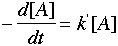 ここで k は速度定数とよばれる.この微分方程式を解けば,2 次反応の速度式が得られる.反応速度は単位時間当たりに起こった反応の数である.単位時間はSI単位を使えば,秒であり,反応の数はモル濃度で表す. ここで仮定を加える.A の濃度に比べて B の濃度が十分高く,反応の期間において減少する B の濃度が無視できる場合には,取り扱いを簡単にすることができる.反応速度の式は, k [B] を新たな定数として k 'とすると,