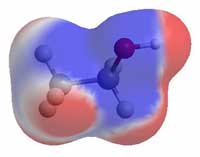 図 10.5 エタノールの分子モデルと電荷の分布(青が負,赤が正)