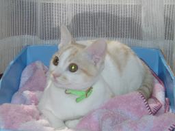 白地にちょこっとチャトラがはいった、目のくりくりしたかわいい子です。