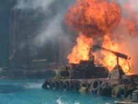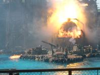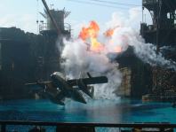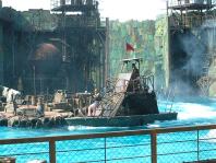映画「ウォーターワールド」の浮遊都市アトールで、伝説の陸地 ドライランドを巡って、海賊との壮絶な闘いを再現! ショーの前に拍手とブーイングの指示があって、ちゃんとしないとバケツで水をかけられちゃいますよ〜 ウエ〜ブをやってみたり、観客も一体となって盛りあがっちゃいます。 3000名入るアリーナのブルーの席は、100%水がかかります でもどこで水をかぶるか、わからないんで、ここでもカッパは必須 壁を突き破って、本物の飛行機が目の前に飛び込んで来たり、石油タンクが大爆発したり、悪党ディーコンが火だるまになったりで もう迫力満点のすご〜いショーでしたぁ〜(゚-゚) |