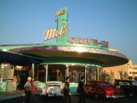 映画から抜け出たような、50年代のムードいっぱいの ドライブイン! 映画「アメリカン・グラフィティ」の世界に入ったよう〜 停めてあるアメ車がムード作りに一役かってました〜 混雑する店内で空席GET! 座れる事がチョーうれしかったですぅ〜 ハンバーガーとアイスティーで軽くお昼といたしましたぁ〜 |