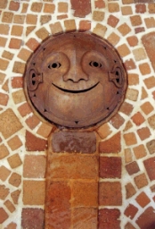 | 「パティオのマンホール」 井戸水が流れる先は、顔の形をしたフタがあります |
