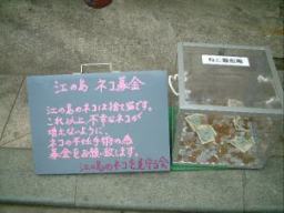 「江ノ島 ネコ募金」 不幸なネコが増えない様にと、不妊手術 の募金箱が置いてありました。 江ノ島のネコを見守る会・・・。 この子たちは、ちゃんと見守られて いるんだね 私もちょっとだけど、チャリ〜ン(^^ゞ |