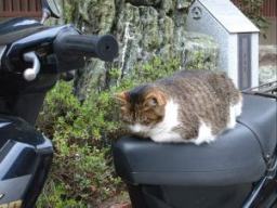 | お土産物屋さんの通りに置いてあった バイクの上で休憩中! ニャンコライダーだね(^○^) |