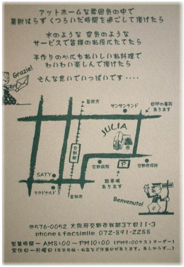 京阪交野市駅を降りてぶらり歩いて行くと・・・ 緑と花に囲まれたステキな建物が見えてきます。 coffee & Restrant「JULIA」 遠方からも車でモーニングしにくるとか・・・ ジュリアママをはじめ、スタッフみんなの笑顔と 美味しい料理が、何度も足を運ばせる・・ そんな素敵なお店です。 |