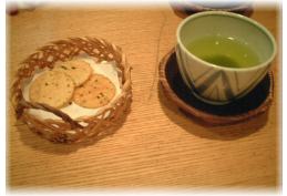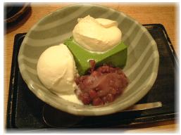 ←席にすわると、美味しいお茶とお茶うけのお菓子が・・・・。 「抹茶ババロア」¥750 → 上にのってる甘さを抑えたクリームと小豆あんとのハーモニーがGood! バニラアイス添えにしてもらい、ひんやりと、さらに美味しさUP! |