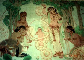 現在はその地に日本・チベット・中国のお寺が建っています。その中心地には、6世紀に作られた巨大なダーク・ストゥーパ(仏塔)がそびえ建ち、その塔の周りを、チベット・中国・日本の信者達がお経を唱えながら巡拝していました。かつて多くの僧達が修行していた僧院の跡が、芝生の中に赤いレンガの土台を見せています。私達は、日本人画家野生司香雪の壁画で有名なムラカンダ・クティ寺院を訪れ、お釈迦様の仏像の前で、報恩感謝のお勤めをさせていただきました。 (次回はベナレスのガンジス河での沐浴より)