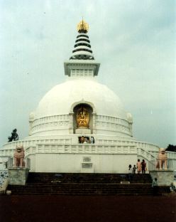 次に訪れたのは霊鷲山の続きの岩山(多宝山)にそびえ立つ「日本山妙法寺」と「世界平和塔」(純白のストゥーパ)です。霊鷲山から続きで登れるのですが、一旦下山して「日本山妙法寺」が作った「リフト」(日本のスキー場で使用していたリフトを使っていました)で登ることにしました。(3人の元気者は霊鷲山から直接多宝山まで歩いて登りましたが)リフトで約10分リフトの下は岩山、少し怖かったですが無事「日本山妙法寺」まで登れました。平和塔は舞鶴の菅坂峠に有るのと形は同じで、巨大で美しい塔でした。 日本山妙法寺のお上人は、舞鶴出身の「小此木上人」で私より一年上の東舞鶴高校の先輩です。高校卒業後、インドに渡られ、25年間このラジギールにて修行されています。小此木上人には何の連絡もせずに、突然の訪問でしたが、本当に親切にして戴き有り難かったです。本堂にお参りし舞鶴から持参した「写経」をここで奉納しました。本堂に響くお題目は感動的でした。 今回インドの寺院を参拝する機会が多くありましたが、この「日本山妙法寺」が一番清潔で美しく管理できていました。広い境内には、何人かの手伝いのインド人が、箒で清掃していましたし、驚いたことにトイレは水洗でした。この高い山頂に水洗トイレがあるとは感心しました。