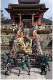 秋日和の清水の舞台、法螺貝を吹き、「転法衆」を先頭に、「会奉行」「夜叉神」 そして「四天王」と青龍、「十六善神」の神々が続くという大群会行の行道が境内を練り歩きます。