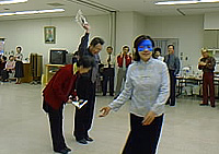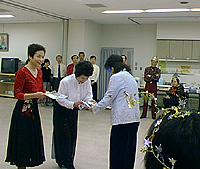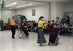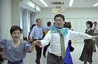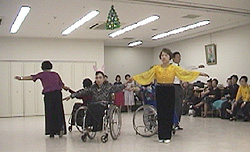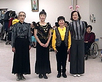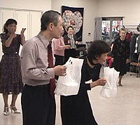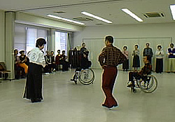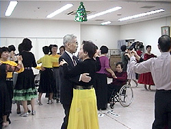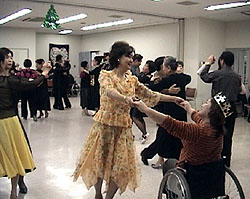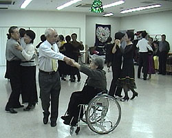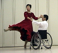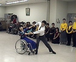 | ブルースゲームの優勝者、藤原・谷口ペア。 | 車いすダンスでは、マンボを披露。 石嶺夫妻、デビューです! |