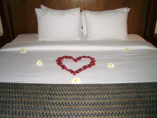 そして念願かなう。ベッドには花びらが飾ってあった。これはハネムーナー用のサービスだ。どうやら旅行会社の手違いで我々は『新婚旅行』ということになっているらしかった。旅行会社に予約に行ったとき、「新婚旅行ですか?」と聞かれたような気もするが、「そうです」と答えた記憶はないけどな。