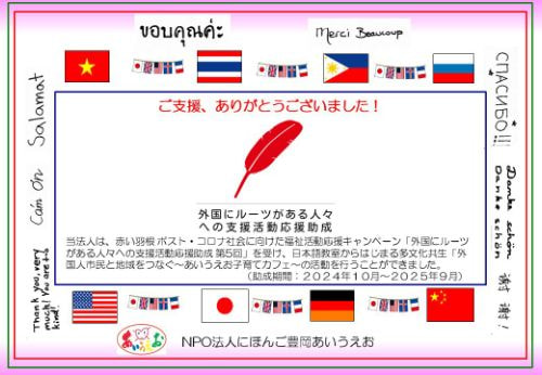 当法人は、赤い羽根 ポスト・コロナ社会に向けた福祉活動応援キャンペーン「外国にルーツ がある人々への支援活動応援助成 第5回」を受け、日本語教室からはじまる多文化共生「外 国人市民と地域をつなぐ~あいうえお子育てカフェ~の活動を行うことができました。 (助成期間:2024年10月~2025年9