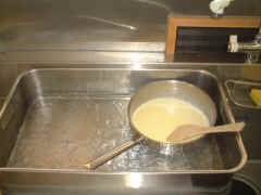 アイスクリーム状になるまで混ぜる ココで冷水がボールの中に入らないよう十分注意すること! |