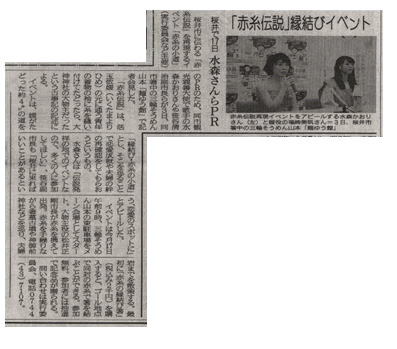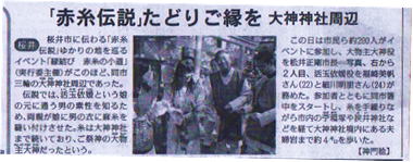 | 【縁結び~赤糸の小道催し】 実施日 平静27年10月17日(土) 箸墓古墳から大神神社・夫婦岩まで[4kの道のり]を 大物主[松井桜井市長]が辿り、活玉依媛がその糸を手繰り 辿り人 とご一緒に歩みました。 当日はNHKからの取材も受け、ならナビ・ぐるっと関西でご案内頂きました。 ・結び人 大物主が辿った跡の赤糸を支えて頂き、辿り人のご縁を支えて頂きました。 ・辿り人 大物主が辿った跡の赤糸を 手繰る媛に随行してご縁を結んで頂き、改めて絆に感謝を頂きました。 夫婦岩で 大物主と媛が再開し、合わせて 辿り人・結び人が結集し 催しの成功を祝いました。 |