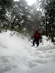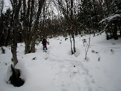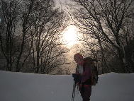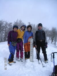 | 新年会(蓬莱山)登山報告 (山行日) 2011年1月15日(日) (参加者) マゼンタ、H郎、T生、Y・I 、とらちゃん(記) (コースタイム) 平(9:30)〜アラキ峠〜権現山(10:15)〜ホッケ山〜小女郎峠(12:30)〜小女郎池(12:40 昼食) 〜蓬莱山(14:00)〜打見山(14:30)〜ロープウェイ〜バス〜JR志賀駅 (報告) 堅田8:45のバスに乗りました。 丁度雪山歩きのシーズンなのでバス停には長い行列。 一つ前の電車できていて正解でした。 平に着くと2〜3の山の会の集団がいて、今日はかなりのにぎわいでした。 もうかなりの人が入っていたのでトレースがついていました。 前の集団の後ろをゆっくりと登りました。 アラキ峠を過ぎてかなりの登りになると、まえのスノーシューをはいた人達が登りづらいらしくもたもたしているので、 追いこしたいのですがなかなか追いこせず・・・で、やっと追いこし快調に進みました。 右手に琵琶湖が見え、一面の銀世界ですばらしい景色です。 ![]() 権現山で記念写真をパチリ。 やはり冬の雪山は最高です。(天気がよければですが) 小女郎池のほとりで昼食、小郎池は凍っていました。 かなり順調なペースで来ていたので、 後はゆっくり行けるだろうと、ワカンにはきかえ、木立の間の道なき道をペッタ、ペッタと雪山歩きを楽しみました。 琵琶湖バレーでは沢山のスキーヤーやボーダーが滑っていました。 琵琶湖バレーの食堂でゆっくりしロープウェイ、バスで志賀駅に行き、京都で新年会をして解散しました。 楽しい一日でした。 計画してくださったマゼンタさん有り難うございました。 H郎さんお世話になりました。 久しぶりにみんなと雪山に行けてうれしかったです。 銀世界 琵琶湖を眺め ルンルンと 雪はすべてを 真白くすなり 皆さんまた一緒に行きましょうね。 |