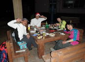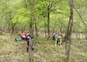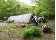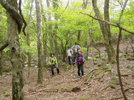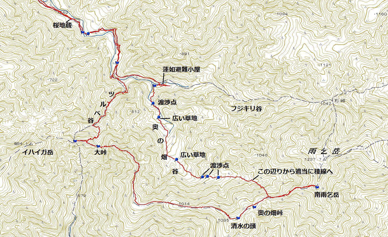 | 鈴鹿 奥の畑〜清水の頭〜大峠〜ツルベ谷 周回ルート =忘れられない景色と再会= (山行日) 平成24年5月20日(日) 前夜発 (参加者) CL北岡 Mちゃん Tちゃん H美さん 伊東(記) (コース) 岩ヶ谷林道 〜 桜地蔵 〜 奥の畑谷 〜 奥の畑峠 〜 南雨乞岳(ピストン) 〜 清水の頭(ショウズノカシラ) 〜大峠〜ツルベ谷〜岩ヶ谷林道 ) 6年前 山を始めて少し経った頃 訳も分からずただただ付いて行った奥の畑〜清水の頭〜大峠〜ツ ルベ谷の周回コース。束ねた草や木を掴みながら よじ登った美しい稜線と眺望が忘れられず いつかま た訪れたいと思いながら 丸6年。 今回 相棒と予定していたところに 山仲間から 「前夜発でどこか連れて行って下さい」とのリクエ ストがあり、このコースを提案しました。 大阪駅 旧中央郵便局前にpm7時集合。Tちゃんの車で出発。久しぶりの再会に話が弾み、 名神八日市ICを出て10分走ると あっという間に 今日のねぐらの「道の駅あいとうマーガ レットステーション」に到着しました。邪魔にならない所にテントを張り(Mちゃん、Tちゃんはツエルト) 早速宴会に突入。H美さんが用意してくれた食料で盛り上がります。 ![]() 山談義に花が咲く 11時前にはテントに入り「おやすみなさーい」。 が、若者達のぎんぎらに装飾を施した数台の車のライトの明るさとボリュームいっぱいの音楽がやかましく 眠れません。 注意する勇気もなく ただただ去りゆくのを待つだけでした。 たぶん0時過ぎに去って行ったのでしょう。 その後もうつらうつらと寝たり起きたり 悶々としながら夜が明け5時前には起床です。 寝不足の不安を抱きながら準備をして予定通り6時出発です。 甲津畑集落から道なりに30分走り、鳴尾橋手前に駐車します。すでに3台の車が駐車しています。 少し戻った所に登山口があり登山口には登山届のポストがありました。 (我々はすでに管轄の東近江警察署にFAX送信済みです。) 岩ヶ谷林道が地道になり植林の中を道なりに進むと桜地蔵。 立止り 今日の安全登山を祈願します。ほどなくツルベ谷の分 岐です。帰りはここに下りてきます。三度目の橋を渡ると、 雨乞岳 杉峠との分岐。何の疑いもなく 分岐の少し先の登山 道に入り、蓮如避難小屋前を少し進みます。あまりにも整備 された道が6年前の記憶と違います。 桜地蔵 蓮如避難小屋相棒がGPSで確認すると、違う方向へと進んでいるようです。 「そういえば 木の枝でとおせんぼしたところがあったなぁー」ということで引き返しました。 木の枝で とおせんぼ(通行止め)した道が進むべき方向でした。 以前は「奥の畑」という小さなプレートがあったらしいのですが、安易に入り遭難が多いのでしょう。 その為そのプレートが撤去されたらしいのです。 道は谷に沿って山腹を進みますが 所々ロープが張られ 眼下には渋川が流れています。柔らかな 新緑に感嘆の声をあげながら進むと広い草原のような空間が現れます。「下の奥の畑」に到着です。 少し行くと「上の奥の畑」。コバイケイソウが30センチほどに成長しています。 藤の花はまだ蕾です。この癒される草地で一息入れます。 ![]() 最初の渡渉 二度目の渡渉 三度目の渡渉前方には目指す雨乞岳から清水の頭の稜線がくっきり見えます。 これから奥の畑峠によじ登る地点までテープを探しGPSで確認しながら 奥の畑谷の渡渉を繰り返し、横に広がった どこを歩いてもよさそうな森を谷に沿って、 付かず離れず歩き稜線に這い上がれそうなポイントを探します。 調べる段階で他の人のブログを見ても、みんな色々な所からよじ登ってます。 相棒の「よしっ ここをよじ登ろう」の声で束ねた下草や木を掴みながら急な斜面を ずり落ちないように登ります。 谷から離れ稜線へこの這い上がるポイントを間違うとかなり苦労するようですが、ドンピシャだったのか あまり苦労することなく稜線に到着しました。 ガスであまりきれいには見えませんでしたが、「この景色を見たかったー」と感激もひとしおでした。 陽気で元気なTさんとMさん 南雨乞 清水の頭に向かって 清水の頭私もH美さんも雨乞岳は何度か行っているので、予定の南雨乞岳ピストンはどうでもよくなり、 もっとこの空間に身を置きたいということで、男性3人が空身で走るように登って行くのを 見送り、眺望とおしゃべりを楽しんでいましたが、男性達はあっという間に帰って来ました。 さすが兵庫県武庫労山の六甲全縦で毎年上位の成績をおさめている強者です。 相棒はヒーヒ―言いながら付いて行ったことでしょう(笑) 風は冷たいですが、笹原の稜線をゆったり歩くと清水の頭です。 少し早いですが、ちょっと下った眺望のよいところでランチタイムです。 さあ 大峠を目指します。新緑に目をやりながら進むと尾根が痩せ始めます。 痩せ尾根の左右にシャクナゲの木が並び まさしくシャクナゲ街道の始まり 始まりです。 今年は裏年か花付きがもう一つです。 全く花を付けていない木もありますが、 中には木いっぱいに花を付けた
