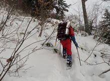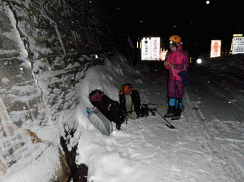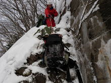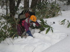 | 2012年山始めは2つの活火山 《 あえなく撤退の巻 》 (記;伊東妙子) 行 先・・・ 焼岳(2455.4m)とアカンダナ山(2109.4m) 山行日・・・ 平成24年1月1日(日)夜〜1月4日(水) メンバー・・・ L北岡 伊東 年末の大掃除、元旦行事を済ませ1月1日 伊東のマンション隣のキリン堂(寝屋川)を18時半出発。 順調に走り、23時15分に平湯バスターミナル着。車中にて仮眠。 1月2日(月) 4時50分起床。準備をして6時に予約したタクシーに乗り込む。 10分程で中ノ湯ゲートに到着。(タクシー代3,740円) 中ノ湯ゲートからは宿泊者の車以外は進入禁止なのでタクシーを使わざるをえない。 短距離なのにえらい出費である。 ![]() 6時半ヘッデンを付けて雪がちらつく中、出発。ゲートの紐を外し、中ノ湯温泉旅館まで約40分の林道歩きである。 いよいよ旅館裏手の登山口でスノーシューをつける。昨日登ったであろう人達の足跡がうっすらあるが、 ところどころスノーシューでも新雪ゆえ、沈む。 急斜面は水平に足を置いても滑り、這い上がるのに息を切らす。 林道の途中の道路脇にテープと踏み跡があった。「よし行けるぞ」 とショートカットを選択し進む。 途中から踏み跡はなくなり、雪が深く、沈みながら、木の枝の間をくぐり、夏道と合流する頃にはもうヘロヘロ。 あのまま林道で夏道を行けばよかった。 絶え間なく雪は降り続いている。でも風がないので寒くはない。 その後もラッセル、ラッセルで、急斜面は滑り落ちながら、這い上がり、りんどう平の先の平らなところで、11時半。 目の前に岩と雪がミックスして、ゴツゴツした焼岳上部が姿を現した。しかしそれも一瞬。 すぐにガスで先が真っ白。姿を拝んだのはその一瞬だけだった。 ![]() 時間を計算すれば、その先を進むのは無理と判断し、森林限界から上部で使う予定だったピッケルとアイゼンに 替える前に敗退することに・・・。 12時下山と決めツエルトをかぶり、ラーメンとパンで腹ごしらえ。 下りかけたところで、二人組の男性に会う。 後にも先にも会ったのはこの二人組だけである。 彼らも私達と同じところで引き返すという。 2時間で中ノ湯温泉旅館前。ゲートを出たところでスノーシューを外しゲートから7、8分歩いて中ノ湯バス停。 3時20分発の路線バスで平湯バスターミナルへ。(バス代540円) 今日は一日中 雪がしんしんと降り続いた。 この日はレストランで腹ごしらえをし、車中泊。 1月3日(火) 以前から、気になっていた平湯アカンダナ駐車場の裏手にあるアカンダナ山。無雪期は藪で登れない。 地元の人も知らないマイナーな山だ。 調べる時点で、色々なブログを見ても山スキーで入る人はいるが登山の記録がなかなか見当たらない。 山スキーの人達は沢筋から入り、沢を下降時に自ら雪崩を起こしているという記述があった。 考えた末、尾根筋を辿ることに。地形図で見ると結構な急斜面のようだ。 起床後、計画通りアカンダナ山に登るか、計画変更して、新穂高ロープウエイまで車を走らせ、 確実にトレースがある西穂山荘、そこから丸山か独標までとするか話しあう。 結果 登山口に車が一台もなければ、計画を変更しようということで、アカンダナ山登山口まで車を走らせた。 やっぱり車は一台も停まっていない。が、スキーの後があるではないか。よし 予定通りアカンダナ山を登ろう。 スノーシューを履き用意をして出発。 すっかり出発が遅くなってしまった。その時点で、心の中にまた敗退の2文字が・・・。 ![]() 薄いスキーの跡を辿りジグザクに登っていく。昨日降ったフカフカの雪の上はスノーシューでも沈む沈む。 ラッセルしながら、また急斜面では滑り落ちながら這い上がり、1時間少しで林道に出た。 スキーの跡は沢筋へ。私達は尾根筋へ。 が、3m位のコンクリートの壁と金網に阻まれ立ち往生。 ここを越えなければ先へは進めない。 沢筋へ行く選択肢は全く考えになかった。 諦め切れない北岡さんがよじ登れる所を探しに行く。 あったぞ 金網が幅1m位なく、丸いデコボコの石垣が・・・。 よしここを登ろう。 スノーシューからアイゼンに替え、まず北岡さんがピッケルを石の角に引っ掛けながら何とか登りきり、 ロープを出してもらい伊東が登る。 やれやれである。 トレースはなく見るからに雪が深そうだ。 行ける所まで行こう。 急斜面で直登は無理なので、ジグザクに行こうと足を出すが雪が深い。 あまりにも深い。 だんだん気持ちが萎えてきた。 もうこれ以上進むのは無理。 伊東の「もう引き返そう」の一言でまたもや敗退決定である。 登ってきた石垣を今度は懸垂下降で降り林道の雪の上に座り込み、長い休憩を取った。 下りはショートカットしながら、真っさらな雪にズボズボ入りながら楽しく下ることが出来た。 駐車地で善哉を作り、ゆっくり寛ぐ。このまま帰阪しようか? でも当初翌日4日帰阪の予定だしもう少し雪景色の銀世界に身を置いておきたいな。 ということで雪と戯れ、温泉に浸かりまたまた車中泊。 翌早朝に雪