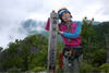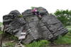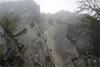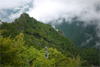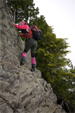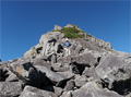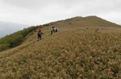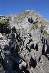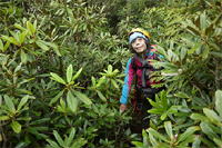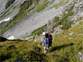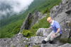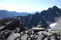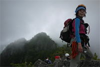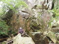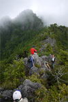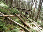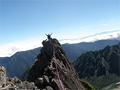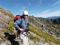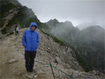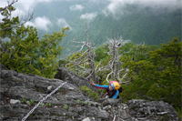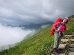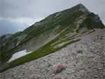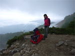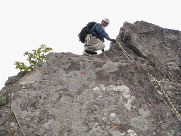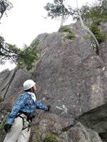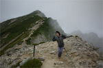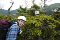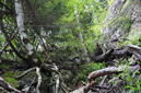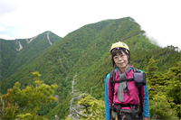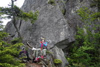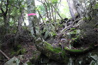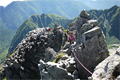 奥秩父・鶏冠山(とさかやま・2115m) ![]() 西沢渓谷から木賊山(とくさやま)への岩峰と藪のルートを行く (山行日) 2012年7月15日 (参加者) 北岡(報告)、伊東 (報告) 今年のGW、金峰山から甲武信ヶ岳への縦走を終え下山途中の戸渡尾根で目にした あの険しそうな山容が忘れられず、帰宅後調べてみますと途中まではテープが 多数付けられた「踏跡」があるらしいのです。 いつかは登ってみたいなと思っていましたら早くもその機会がやってきました。 梅雨明け前の連休、幸いにもこの山域の天気は良さそうでした。 といいますか幾つか山域別に山行を計画していて一番天気の良さそうな山に行こうという作戦でした。 吊り橋からの鶏冠山 ![]() 西沢渓谷入り口バス停傍の、国道140号西沢大橋が大きく円を描く陸橋下に設けられた無料駐車場を出発。 白みかけた林道。二俣吊橋の中程から薄いベールをまとった鶏冠山が見えました。 今日一日の長い道のりを思い必ず成功させるぞという決意がこみ上げてきます。 吊橋の後に続く小さな鉄の橋を渡るとそこからは一般遊歩道と別れいよいよ本格的な鶏冠尾根への バリエーションルートの始まりです。30分程向こうの鶏冠谷出合に行く途中のトラバースで足を滑らせ トラロープに危ういところを助けられ冷や汗。出だしからこれです。・・・この先どうなることやら。 西沢渓谷入り口バス停傍の、国道140号西沢大橋が大きく円を描く陸橋下に設けられた無料駐車場を出発。 白みかけた林道。二俣吊橋の中程から薄いベールをまとった鶏冠山が見えました。 今日一日の長い道のりを思い必ず成功させるぞという決意がこみ上げてきます。 鶏冠谷と東沢の合流点に着きました。ここで登山靴をザックにしまいズボンをまくり上げ裸足になって渡渉。 相棒はバランスよく渡りきりました。次いで僕、ストックがないことに加えザックの重さと生来のバランスの悪さで うまく歩けません。 両手をバタつかせ、こんなところで踊っている場合じゃないんですが…。 膝上までの深間にはまりズボンを濡らしながらヒヤヒヤしながらもなんとか渡りきりました。 登山靴を履きハーネスを付けて出発準備をしている間に後続の2パーティー7人に先をこされました。 いつもながらのグズです。 30分歩いて5分の休憩。このペースでゆっくりと細尾根の急登をこなしていきます。 先行の4人組と抜きつ抜かれつのお付き合い。 高度1750mの岩塊群を乗越す辺りはトラロープがあちらこちらに張られてあって安心して ルート取りができました。(下3枚の画像) ![]() 「チンネのコル」と小さく書かれた道標のあるところから岩峰縦走の始まりです。 次々とピンクのテープが現れます。これだけテープがあればルート迷いはしませんね。 1986m峰の手前には二箇所の鎖場がありました。一つ目のは難なく通過です。(下3枚の画像) ![]() 一つ目を登り切り前方を見るとびっくりです。「あそこへ向かうの!?」 すぐに基部に着きました。 ちょっと嫌らしい感じで僕は第一歩目を力任せに鎖にしがみついて登りきりましたが相棒は足が届かなくて、 すぐ横の違うルートから登ろうとするのですが第一歩目に苦労しています。 上からスリングを繋げて垂らし、なんとかクリアー。 ![]() (上2枚・1986m峰手前の一つ目の鎖場の上から進行方向を見る) ![]() (上2枚と右・二つ目の鎖場の登りと岩上から進行方向を見る) 岩峰の上に立つとこの先もまだまだ痩せた岩尾根が続いています。 振り返っても進行方向を見てもどれがなんという岩峰かわかりません。 多分コンパス、地形図を出して山座同定する気持ちの余裕がなかったのでしょう。 どれが第一岩峰?、第二岩峰?、どれが鶏冠山? 目的の山がどれかわからないなんて大笑いです。(でもよくあることですよね。) もし又この山に登ることがあればその時にはしっかりと同定したいと思っています。 「第3岩峰迂回路」と書かれた道標のある場所にやって来ました。 ということはここが第三岩峰なんでしょうね。 第三岩峰基部 先程から見えていましたラクダのコブのような岩峰が第三岩峰ということのようです ![]() 周囲の景色を隠すガスですが良いことも。暑さをしのげて時々は涼風を運んできます。ここで大休止。 抜きつ抜かれつの4人組とはここでお別れです。25分ほどの休憩の後、岩峰の登攀にかかります。 と言いたいところですが我々にはもっともっと修業が必要です(笑) ここから数メートルの急下降をして岩を巻くように登り返すとこの第三岩峰の岩頭に出ました。 左の写真のような標柱が立っていました。地形図にある「鶏冠山2115m」はまだこの先です。 ![]() 甲武信ヶ岳 木賊山2177m峰にて・疲れが表情に出てます 先ほどの標柱から30分程かかり鶏冠山2115mに到着です。 ここからは甲武信ヶ岳や木賊山が大きく望まれます。 ここから木賊山まで標高差で計算すると通常なら約1時間30分。 しかしこのルートはそんなに甘くはないようです。それで倍の3時間かかると見ました。 ところが