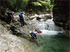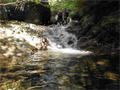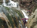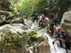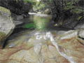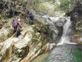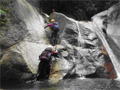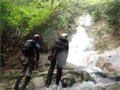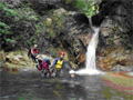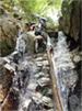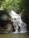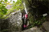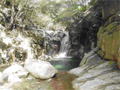 | 鈴鹿・元越谷(本谷)遡行 (山行日) 2012年7月29日( (参加者) 三木、松本、高橋、真鍋、伊東、北岡(報告) 元越大滝[透明感あふれる釜と美しいナメを満喫] 大阪・天王寺駅前に久々の仲間が集合。今日は暑さを忘れて別世界で楽しんできます。 西名阪・関ICを出て鈴鹿スカイラインへ。近くの山々の稜線付近にはガスがかかっています。 しっかりと晴れて水面をキラキラ輝かせて欲しいんだけど。心なしか昨日よりは涼しい感じ。 沢登りなんだから晴れて暑くなってくれないと震えながらでは楽しめないよ〜。 野洲川ダムの少し先にある大河原橋を渡り林道を少し入った路肩に駐車。ここから沢装束で歩き出します。 今日のメンバーにはそれぞれ役割があります。 トップ(松本)は勿論ルーファイ、2番手(伊東)はトップの暴走の制止、3番手(高橋)は4番手の引っ張り上げ役、 4番手(真鍋)は?愛嬌かな(笑)、5番手(三木)は4番手のおしり押上役と最後尾の引っ張り上げ役、 そして最後尾の僕はおしり専門の写真係。 ![]() 荒れた林道を30分ほど進み、道がヘアピンカーブしている辺り(高度540m)から谷へ降りていきます。 いきなりの急斜面です。朝一で体の動きがまだ硬いので念のためロープを出しました。 大きな石がゴロゴロ転がっている川床に降り立つとそこには澄んだ流れがありました。 「綺麗〜!」 今日の沢の感触は? 「お〜冷てぇ〜」 足の付根くらいの水深をまだ慣れない足取りで 進んでいきます。 5分程で大きな堰堤(地形図では2連)です。軽く高巻いて通過。 また5分程で堰堤です。 二年前友人の案内で来た時には高巻いた後の下降に神経を使いましたので今日はロープを出して フィックスしようかと考えています。でも上にあがるとうまい具合にトラロープがしっかりと下まで張られてありました。 水がだんだんと温かく感じるようになると皆さん果敢に流芯を攻めます。 大きな釜では自称「カナズチ」の女性二人はロープで引っ張ってもらい、さながら水上スキーの出だしのようです。 入渓から50分、本日一番の見所、「元越大滝」に着きました。 前回より水量は少なく感じましたがでもなかなか壮観です。皆さん感嘆符の連続です。 これだけ喜んでいただければ案内したものとしては冥利に尽きるというものです。 ここは右側のガレを登り上部では木の根やトラロープに助けられ落ち口へ。 ![]() その後も次から次へとナメとエメラルドグリーンの透き通った釜が現れます。 この谷には「うだる」とか「極暑」なんて言葉は存在しません。 昨日、相棒とふたりで六甲のロックガーデン周辺を暑さでヘロヘロになりながら歩いていたのとは大違いです。 夏場の遊びはこれに尽きますね。 ![]() この沢は水がほんとに綺麗で、特に難しいところもなく高巻きも少なく初心者向きです。 それでいて適度のスリルが味わえ、また泳げるような釜もたくさんあって僕なんかにはうってつけの沢です。 その分、同行の男性3人には物足りなかったかも知れませんが。 ![]() まだまだ釜が続きます。 泳ぐ人、へつる人 皆さんの動き、表情みんな最高です。 童心に帰って楽しんでいます。 水沢峠へ向かう沢との分岐二俣(高度615m)地点は日当たりもよくて全員が揃って休めそうな 大きな白い石がありましたのでここで昼食にしました。 ![]() この分岐から暫くは平凡な沢歩きです。大滝からこの分岐にかけてがこの沢の一番の楽しみどころ かも知れません。 とは言ってもこの先も美しい流れの小滝が連続します ![]() この分岐から暫くは平凡な沢歩きです。 大滝からこの分岐にかけてがこの沢の一番の楽しみどころかも知れません。 とは言ってもこの先も美しい流れの小滝が連続します。 たまには僕の写真も小滝群に少々飽きてきた頃に仏谷出合(高度725m)です。 ここを過ぎると狭まった岩間にかかる滝が出てきました。 両手両足を踏ん張って超えていきます。 次は滝身に流木が刺さっています。さてどこから登ろうか。どこに足を置いても滑りそう。 この後は廊下になって少ししてみんながびっくりするような長い滝が見えてきました。 僕の前回の記憶にはありません。近くまで行きますと何の事はない。 幾つかの滝が連なって長く見えていただけです。多段30mの滝です。 右側の階段状になった岩で難なく登れました。 そこから先は大して変化のない細い流れを辿り高度845mで沢中歩きを終了しました。 沢靴から登山靴に履き替え稜線の登山道を目指します。水沢峠までゆっくりと30分。 そこから西方向の谷で下山です。早くも気持は温泉です。 沢の中の登山道を15分程下ると(高度750m)工事中の林道が出てきました。 2年前にはなかったものです。 足の不調(靴の不調?)で引きずるようにして歩いていた伊東さん、林道のおかげで少しは楽に歩けるようです。 ゆっくりと林道を辿り17時前に駐車地に戻りました。 ![]() (コースタイム) 駐車地8:50スタート − 猪足谷橋9:08 − ヘアピンカーブ入渓点上部9:26 − 川床、水流に入る9:37 − 元越大滝10:26--40 二俣