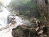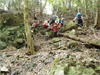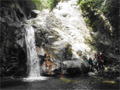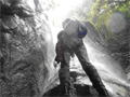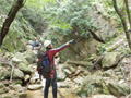 | 鈴鹿 矢原川左俣(本谷)遡行記録 2012年9月2日(日) 現地にて前泊 参加者:大沢・北岡・三木(記録) コース 7:20坂本棚田駐車場出発 → 7:49「矢原川本谷」標識通過 → 8:15遡行開始 → 8:36最初の5mの滝 → 9:10不動下滝 → 9:35高巻終了 → 9:56不動上滝 → 10:20廊下 → 11:00渓流の遡行終了 → 11:33仙鶏尾根に辿り着く → 11:37仙ノ石 → 仙鶏尾根 → 野登寺の参道 → 14:15坂本棚田駐車場到着 ![]() 林道の「矢原川本谷」標識を谷へと下る。最後の下りで足跡を見失って、ずるずるの斜面を滑り降りた。咄嗟に横倒しになっている木にしがみついて、難を逃れたもののズボンは泥だらけ。坂本棚田駐車場から40分余りかかって、ようやく沢に辿り着いた。ここで、登山靴から沢靴に履き替える。とそのとき、左の靴下に2匹、右にも2匹、ヒルが必死にしがみ付いている。手につかぬよう引き剥がす。きっと、あの斜面で滑ったときにやられたのであろう。とりあえず、目に見える範囲のものは取っ払った。やはり、この沢もヒルの楽園なのか。 ![]() 遡行を開始して、最初に5mの滝に出くわす。5mとは言え、水量の多さに登る意欲を掻き立てられる。右側から登って、滝の中央を左へ横断、そのまま登りきる。横断したとき、身体は川の内側に入り込んだが、ザックはもろに水を被っていたので、可也の水圧が身体にのしかかったため、しばしその場で踏ん張った。外から見ると、私の姿は完全に消えている。避けて通ることはできるのだが、結構楽しめた。 続いて、5m・4mの斜瀑を登り、5m・6mの滝へと。ここは、左側から水の流れのないところを難なく登る。 これを過ぎると、20mの滝がまっすぐ伸びている。 この下で、「ファイト一発」のポーズを決めたつもりだが・・・。ここは、左の巻き道を使って、滝の上に出た。 続いて、現れたのが本日1番の大滝、80mの不動下滝である。屈曲しているので、下から全貌を見ることはできない。 最初の6mほどのところまでは登れそうだが、その先が分からないので、突っ込むことはやめて、右側にある巻き道を登ることにした。この巻き道の出だしは、小さな沢になっていて、やや登りづらい。少し登ったところで、左手に滝が見えたので、滝に近づいて行った。すると、目の前に、どでかい滝が水しぶきを上げて、その勇姿を表わした。我々の立っている場所の直下で滝が屈曲している。再び巻き道に戻って、高巻く。急な斜面と足場の悪さとで、可也神経を使った。やはり、滝の大きさに合わせて高巻きも長く、体力を要する。 この大滝の上に出ると、のんびりする間もなく3m〜6mの滝が続く。いずれも直登する。その後、10mの滝の左を登り、段になっているところから右へ沢の左の淵を直登する。しかし、あと一歩のところで、上がれず。大沢さんが左を巻いて、お助け紐で引っ張り上げてくれた。このあたりの石は丸く滑りやすそうである。 ![]() 続いて、20mの不動上滝に出くわす。この滝は、不動下滝に比べれば、スケールは小さいが、水量は多く、上流まで真正面に見ることができるので、迫力がある。ここは、左の登山道を巻く。 ![]() その後、廊下を伝って、再び連瀑。奥へと進む。両岸が狭まったところで、滝は左上方から水を流し出している。沢の右淵を登り、一段上がったところで、沢を横断し、左淵へと移動する。その先は、左を直登して、滝を通過する。 ![]() この後は、水と戯れる程度のもので、遡行の終了も近づいていた。 高度670mの二俣あたりから倒木が見られたが、コースを左にとって行けば、気にするほどではなく、上流まで水量が多かった。 ![]() 沢の幅が著しく狭くなって、水量も減ってきたので、沢から外れて、遡行を終了、登山靴に履き替えた。 仙鶏尾根まで約30分、急斜面の足場の悪いところを直登するには、気合がいる。 仙ノ石で休憩。その後、野登山から坂本棚田駐車場へと下山。 この沢は、距離は短く、川幅も狭い。そのため、鈴鹿の元越谷や石谷川・本流のように明るさはなく、やや暗く感じる。しかし、この狭いエリアに数多くの滝が存在し、全く飽きることなく、次から次へとその勇姿を現す。のんびりと一息ついている暇はなく、時の経つのをすっかり忘れてしまう。昼食も簡単に済ませており、休憩をしたという認識がないほどである。 大滝を除いて、直登できるのも魅力である。但し、釜のスケールはいずれも小さく、泳げるところはなかった。 前夜、雨に降られて、ヒルの大量出現かと、また、高巻の地面のぬかるみにと心配をしつつ、坂本棚田駐車場を出発したが、沢についてみると、川の水は濁っておらず、ヒルと対面したものの被害はなく、無事沢登りを満喫することができた。天気は、全般に曇っていたが、時折晴れ間も見えた。 このコースの難を言えば、下山の仙鶏尾根の距離が長く、斜度もきつく、土質が滑りやすいこともあって、神経、体力ともに消耗した。野登寺の参道もお寺参りの人が歩いている様子はなかった。 しかし、満足度は、