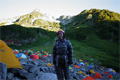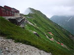 | 北ア・八方尾根往復 唐松岳から不帰の嶮の縦走予定が撤退に (山行日) 2012年8月13〜14日 (参加者) 伊東、北岡(報告) 唐松岳とコマクサお盆休みの12日、14時過ぎに車を走らせ一路、信州へ。 今回はメジャーな山行がしたいという相棒のリクエストで「不帰の嶮」へ行きます。 道路は比較的空いていて快適に走ります。豊科IC出てすぐのロイヤルホストで夕食。 目指す八方第5駐車場(無料)には22時頃到着。 大きな駐車場にはすでに40台くらいが入っていました。 早速車中泊の仮眠に入りますが暑い。窓を少し開けて寝ることにします。 しかし…蚊が…(-_-メ)。 8/13、今日は4時間ほどの歩行時間でテント場着です。 そう早く出発しなくても良いのですが予報通り空模様が怪しい。 本降りになる前に到着しておきたい。 出発準備をしているとタクシーの運ちゃんが声をかけてきました。 猿倉への客を集めているのです。 この八方からバスだと一人900円。タクシーだと一台3000円。 4人集めて走らせるみたいです。 八方に車を置き、猿倉へバスかタクシーで入り、大雪渓、或いは鑓温泉経由で唐松岳へ、 そこから八方尾根を使ってこの八方に降りてくる人が多くいるらしい。 自分たちは逆コースなので猿倉に下山してからここまでバスかタクシーで戻る計画です。 駐車場からゴンドラ乗り場まで少し歩きます。 地図では10分とありましたが20分くらいかかったでしょうか。 ゴンドラ乗り場の近くにある各駐車場は有料です。 ザックの計量をします。 15s以上は400円の荷物料を払わなければいけません。 相棒は13キロ超、僕は19キロ超。 自炊用の水を捨てたり中身を手荷物にしたりして二人あわせて約3s減らせば400円の節約ですが 面倒だからここではリッチマンになりましょう。 今回の初日は短時間の行動なので少々の歩荷は大丈夫。 ![]() 乗り場はすでに50人くらいの列。ゴンドラ、リフト2回と乗り継いで一気に標高1840mの高原へ降り立ちます。 初日は雨の予報が出ていました。 いざ現地では霧雨だったり止んでいたり。 合羽を着たり脱いだりです。 登山者に混じって観光客も沢山登っています。あいにく視界は20mくらいでしょうか。 時折パッとガスが取れて見晴らしが幾分良くはなるもののアルプスの大パノラマを見ることはできません。 すぐ近くの鹿島槍や五竜岳、そして険しい尾根が連なる不帰の嶮や観光パンフでも馴染みの白馬三山も 全く見えません。 その分、普段以上に登山道脇の高山植物が目を楽しませてくれます。 八方池を過ぎるとあとは登山者の世界です。が、小さな子供連れのファミリーもいます。 こんな天気の山登りを最初に経験すると山嫌いになってしまわないか心配です。 さほど疲れもないうちに突然唐松山荘の小屋裏に出ました。 「エ〜〜ッ!?」 僕の頭の中にはつづら折れの登山道の途中にテント場がありその先に小屋が建っているという景色がありましたが。 テント場を知らないうちに通過してしまったのかな。 とにかく小屋で受付をしなくちゃ。 この頃には風も吹き出し雨も本降りになりそうな気配です。 「今夜は荒れそうやからテント泊はやめて小屋泊しようよ。」と相棒の一声に素泊まり決定。 ところがびっくりです。素泊まり6300円!!。 4500円くらいと思っていたのに。 その上、「この本館は800円追加で7100円です。」素泊まりで7100円です。 高〜〜!! 相棒は受付の女性に悪たれ口を叩きながらも6300円の北館でということで受付を済ませすぐ横の北館へ。 受付嬢が短気な方でなくてよかった( ´―`)フゥー・・・ 本館が800円の追加料金ということはこの北館はかなりボロボロなんだと覚悟を決めて入り口を入りました。 ところが以外や以外。 床や壁、窓のサッシュ、みんな真新しいです。 2段ベッドも廊下もすべて真新しく、トイレも水洗で臭わず廊下は蛍光灯が煌々と灯っています。 混雑時には9人が雑魚寝(ザコネ)の一区画ですが今夜は二人だけで使わせてもらえました。 本館との違いは食堂と売店と自炊者用テーブルがないことくらいでしょうか。 逆に乾燥室は本館より日差しもあり明るいですしよく乾くように思いました。 この800円の差はどう考えても納得いきません。 ![]() この十数年間で(もっと以前からかも知れませんが)小屋経営の考え方が変わってきていると感じました。 それまでは山小屋といえば汚くて狭くて夜は真っ暗で食事もまずくて…といった負の感想しかなかったもんですが この小屋ではそのどれひとつも当てはまりません。 消灯時間も決められていません。 宿泊者は山小屋に都会のホテルと同じような快適さを求めているのでしょうか。 料金がいくら高くても快適に過ごせる方を選択するのでしょうか。(自分がケチなだけか) 夕方小屋の外に出ますと少しガスが取れて風も収まり雨も止んでいます。 晴れていれば眼前に劔岳が見えるのですがガスの中です。 明日の唐松岳と不帰の嶮V峰とU峰が見えましたが後にも先にもこの時しか見ることができませんでした。 小屋の