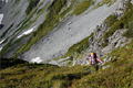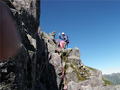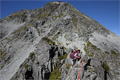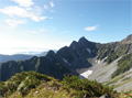 | 北穂高岳(3106m)東稜(ゴジラの背) 〈初級バリルートを行く〉 (山行日) 2012年9月15日〜17日 (参加者) 北岡(L)伊東(報告) 前穂北尾根に行くべきで買ったDVDにおまけのように「北穂高岳東稜」がカップリングされていました。 これはおまけではなく、北穂東稜と前穂北尾根は同一山行で行くということか・・・と思いつつ 前穂北尾根の落石が怖く どうも行く気にならず 今回は北穂東稜のみの山行となりました。 9月14日(金) 19時50分 寝屋川発 飛騨清見ICを0時15分に出、 平湯着1時15分 車中で仮眠。 9月15日(土) アカンダナ駐車場に車を止め 6時20分発のバスで 6時50分上高地着。 身支度を整え今日は涸沢までとお気楽に歩き始めます。 明神で 以前所属していた山の会のメンバーとバッタリ。 なつかしさに話が弾みます。 一足先に歩き始め 横尾に到着。 去年 北鎌へ行った時 ここで昼寝したことがなつかしく思い出されます。 早く涸沢に着いて いいテン場を確保しなければ・・・と思いつつ お尻に根が生えるくらいの大休止。 さあ出発しましょう。 横尾大橋を渡り 屏風岩を左手に見て 誰も取り付いてないなーと思いながら進むと本谷橋。 おおぜいの登山者が休憩しています。 私達もここで またまた大休止です。 いよいよ テント装備と登攀具でズシリと重いザックを背負いながら 本格的な登りが始まります。 登山者が次から次へと途切れることなく登ってきて ちょっとした渋滞です。 アルプスに来ると ほんとに若い登山者が多いです。 みんな重そうなザックを背負ってます。 休憩をはさみながら 涸沢に到着。 石がごつごつしてなさそうな場所を見つけ テントを設営し のんびりです。 相棒はサンマの蒲焼の缶詰をアテに ワインには合えへんな―と言いながら飲み始めました。 久しぶりに この涸沢カールに身を置き穂高連峰を眺めながらの至福の時間が流れていきます。 今日の夕飯はカップ焼きそばです。 今回は登攀具があるので軽量化の為 質素です。 食器は持たず焼きそばのカップを明日の夕飯に使用する考えです。 途中 雨が降って来てテントの中に避難しましたが、やがて雨も上がり 明日の好天が約束されたかのような満天の星空です。 明日のゴジラの背に思いを馳せ 早くにお休みなさーい。 9月16日(日) 4時半起床。 トイレの待ちもあり、出発が遅くなってしまいました。 青空が広がり 絶好の登山日和になりそうでテンションが上がってきます。 ![]() ![]() 涸沢小屋の右手の取付から本格的な登りで、ハイマツ帯に入るとジグザグに登って行きます。 朝一は調子が出ず ゆっくり登ります。 左に一般ルートの南稜への鎖場が見える所を右へ行きます。 岩がゴロゴロしたところで登攀具を身につけ、北穂沢をトラバースします。 いよいよ東稜への取付です。 すでにゴリラの背を登るパーティの姿を確認することが出来ます。 みんな色々なルート取りをしているようですが、私達はルンゼの左の草付きのあたりから登り始めます。 浮き石を一つ一つ確認しながら慎重に登ります。 途中右へ小さくトラバースする踏み跡がありましたが、私達は稜線に向かって直上します。 ![]() ふと下を見ると単独の登山者が立止り 私達をじっと見ています。 落石しないように より慎重に登って行きます。 その登山者はずっと私達を見てますが、登る気配はなく ヘルメットも登攀具も付けておらず どうやら 一般登山道へ行くつもりが こちらへ迷い込んできた様子です。 その後 全く見かけなかったので たぶん自分が行くべきルートへ戻ったのでしょう。 浮き石に気を使いながら登り切り 稜線に出ると 一気に展望が開け 素晴らしい景色が広がります。 ![]() 前穂北尾根の向こうに富士山が見えます。 今まで色々なところで富士山を見てきましたが、期待していなかっただけに感動でした。 お約束の槍ヶ岳もとんがってます。 ここからいよいよ大きな岩が積み重なる岩稜歩きの始まりです。 岩はしっかりしており 安心して登ることが出来ます。 ![]() 1ヶ所北穂沢側の岩棚をトラバースする所があり 一瞬怯みますが、足場もしっかりしており 問題なく通過です。 いよいよ核心部に入ります。 ナイフリッジになった所で 前のパーティがロープを出してます。 ロープなしでも越えれそうですが、せっかくロープを持ってきたので練習のためにもロープを 出そうと前のパーティが通過するのを待ちます。 そうこうしているうちに後続パーティも到着しました。 そのパーティも練習のためにロープを出そうと決めたようです。 いよいよ1ピッチ目 相棒がリードします。 小さな岩にビレーを取り 確保します。 相棒は少し切れ落ちて左から巻いて登ったところにランニングビレーを取り順調に進み 岩にビレーを取りました。 私も問題なく進み 少し切れ落ちた手前で左に下りるところを右に下りたため 少し苦労しましたが 無事1ピッチを終了です。 2ピッチ目も前のパーティが通過するのを待ち、今度は私がリードで行きます。 岩裏のハーケンともう1