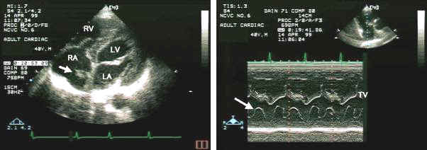 図1.水平4腔断層像(左図)とM-モード像(右図)において右房内に線上あるいは膜様のヒラヒラと動く構造物が認められる(矢印). RA:右房,RV:右室,LA:左房,LV:左室,TV:三尖弁
