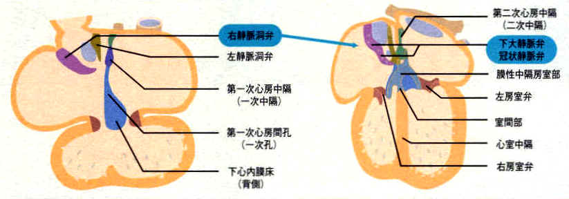 図2.体長10mm頃の右静脈洞弁(左図)が体長40mm頃(右図)には下大静脈弁と冠状静脈弁となり網目状を呈するようになる.