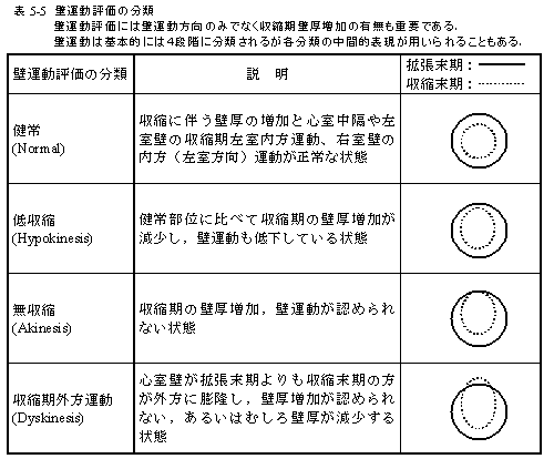 この時の各部位での壁運動評価は大きく4段階で評価され,壁運動異常のある分割部分で虚血を伴ったと判断される(表5-5).