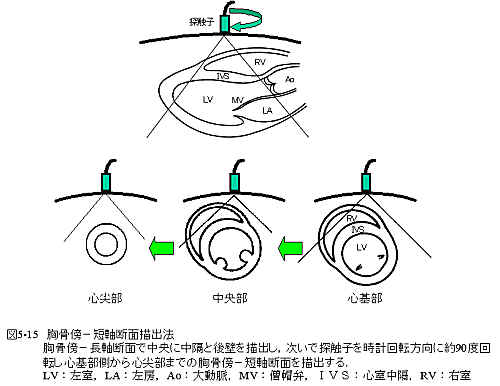胸骨傍−短軸断面は心基部から中央部,心尖部まで描出されれば壁運動評価のほとんど全体が評価可能なほど壁運動評価に適した断面である.描出法としてはまず探触子を第3ないし第4肋間付近に置き,胸骨傍−長軸断面を描出する.この時,視野内の中央で超音波ビームが心室中隔や左室後壁に可及的に垂直に投入されるよう注意する.次いで探触子を時計回転方向に約90度回転し胸骨傍−短軸断面を描出し心基部側から壁運動評価をしつつ探触子を徐々に頭側に傾け心尖部まで壁運動評価を行う(図5-15).探触子を傾けていく際必要に応じては肋間も移動する.