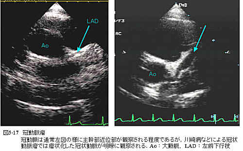 図5-17は川崎病既往患者において左前下行枝に冠動脈瘤を呈した症例である.通常冠動脈は主幹部近位部がかろうじて描出されるのみであるが冠動脈瘤症例では瘤状冠動脈が明瞭に描出されることも多く,症例によっては瘤内血栓なども描出される.
