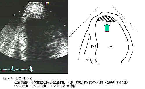 通常左室内は血液鬱滞を生じないため血栓を生じることは無いが心筋梗塞症例では壁運動低下に伴い血液鬱滞を呈し血栓を生じやすい状態となる.特に心尖部に血栓を生じることが多く,心尖部を含めた心筋梗塞では注意を要する(図5-19).