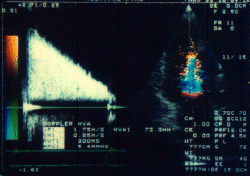 また、右下図は三尖弁閉鎖不全例の4腔断層像上で三尖弁逆流血流に対して連続波ドプラ法を行ったもので、この逆流血流最高血流速度(V)に簡易ベルヌーイ式を適応することにより収縮期右室−右房間圧較差が13.5mmHgと算出されている。これに、右房圧を約5〜10mmHgとして加算することにより非観血的に右室圧が推定されることになる。