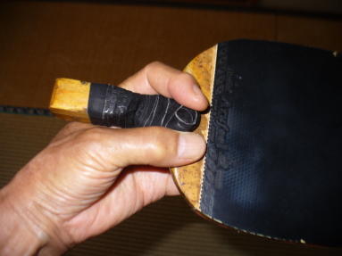 そこで思いついたのが、先ほどの両面打ちのペンホルダーですが、本来の裏面打ちのグリップは、手首の固い私には無理なので、裏面打ち重視のペングリップを考えてみました。