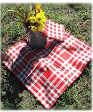 赤いチェックのクロス。昔、子どもの頃にお母さんがお弁当を包んでくれた布に似てる。