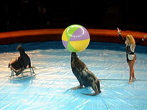 自転車に乗るイヌ、火の棒を回すネコ、「日光猿軍団」も顔負けの空中ブランコをする猿たち、ボールを自由に操るアシカ、椅子に座ったり、二本足で立つゾウ。 |