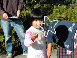 | いろいろとお世話になりました高田です。おかげ様で20日に行われた秋まつりのシャボン玉コーナーは大行列ができる程人気で、大成功でした。お天気に恵まれ、お日様の光を浴びて大きなシャボン玉がキラキラ輝いて飛んでいくさまは、本当に素敵でした。ありがとうございました。 秋まつりの幕が開く寸前まで、いろいろと気をもんでいたのですが、始まってみると子どもたちがたくさん集まり、大きなシャボン玉に目を輝かせて大喜びでした。私がデジカメを持っていないので写真を送れないのが残念です。小学校全児童600人ですので、10人ずつ3分の時間制限でしたところ、最後まで行列が途絶えませんでした。シャボン玉遊びは秋まつりの出し物としては初めての試みで、私たちも子ども用プールの大と小を用意したのですが、もう一つ用意した方がよかったです。 それから、途中で泡がもりもりたってしまい、わくにシャボン液がついてこなくなりました。確か泡をすくうのだったとアドバイスを思い出し、それからは、1回終わるごとに表面の泡をすくいとることにしました。 始まってすぐに理科の先生がやって来て、科学クラブで是非やりたいから、レシピを教えてほしいと言われました。まさに大人も感動したシャボン玉でした。シャボン玉遊びが、来年も次の役員によって引き継がれ、平方小秋まつりの名物として定着してほしいなぁと願っています。 いろいろとありがとうございました。この一生懸命やった経験が自分にとってもプラスになったと思っています。 来年の役員さんが聞いてきたら、asobiyaさんのホームページを教えたいと思います。そのときはまたよろしくお願いします。 |