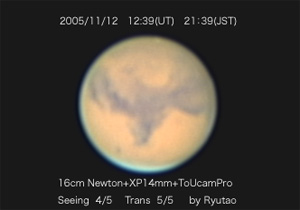 この日はソリス付近にダストストームが発生したということで、その辺りを中心に観望していました。しかし眼視ではよくわかりません。写真に撮ってみると、火星の左上方向にそれらしきものが写っているように見えます。もう少し安定したシンチレーションなら、もっと詳細に捕らえられるのですが残念です。