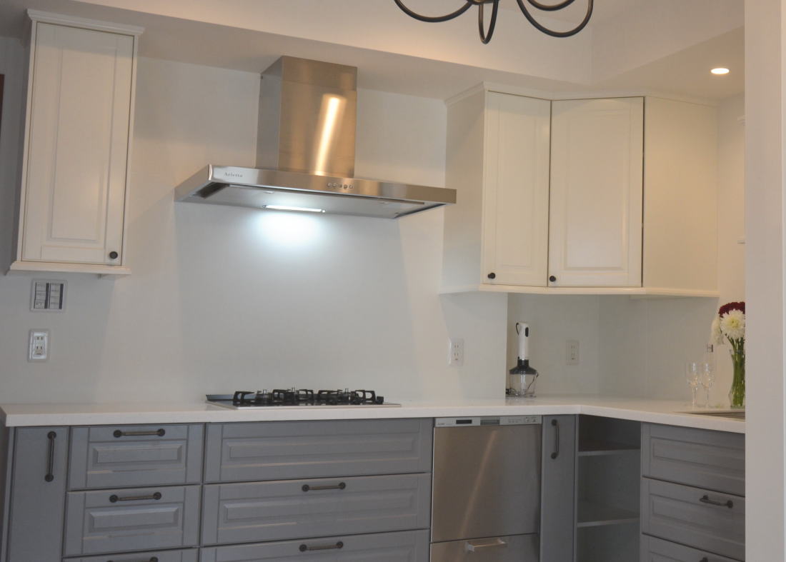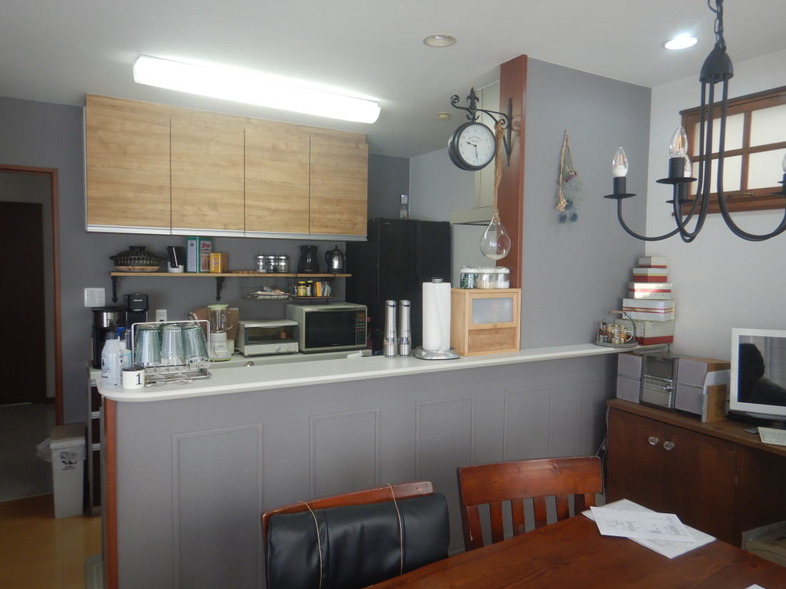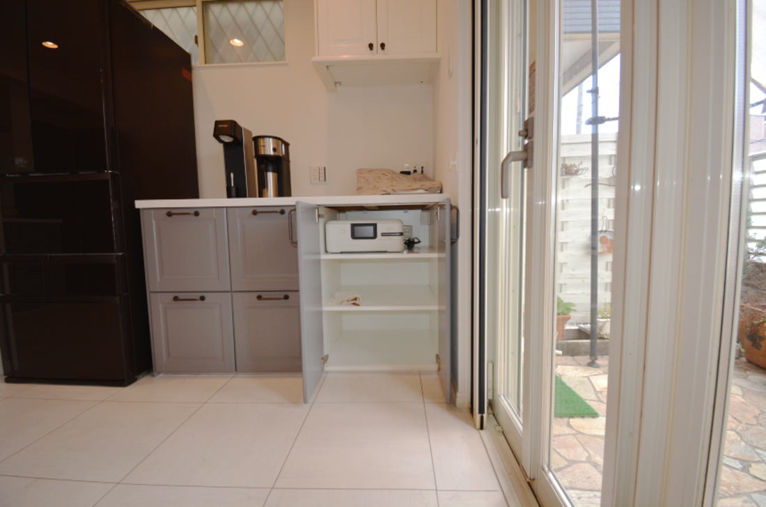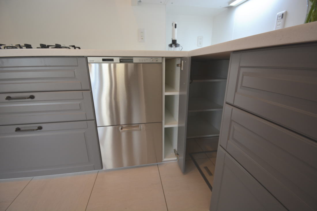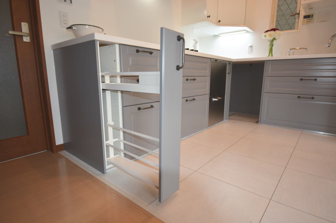 リノベーション後は、キッチン・ダイニングのど真ん中にダイニングテーブルを置かれます。そのダイニングテーブルを囲むようにキッチンや食器収納をプランさせて頂きました。冷蔵庫は元々、コーナーの壁のへこみにあったため通常新しくプランニングするとその壁のへこみは、どうしてもデッドスペースになります。そのデッドスペースを解消するために造作工事で様々なアイデアとアレンジで乗り切りました。