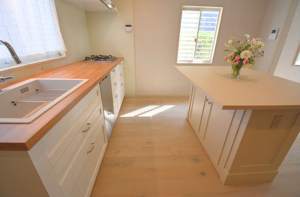 築約30年のハウスメーカーの戸建てを購入して内装を自分たちのイメージにあったデザインにしたいというご希望でした。キッチンダイニングとリビングの間に狭さを感じさせる壁があり、その壁を撤去したい。構造上の問題があり全てを取り払うことは出来ませんでしたが、工事中に開口を広げることができるということでモールディング装飾をしたおしゃれな垂れ壁にすることができました。内装はヨーロッパのアイランドキッチンカウンターのイメージに合わせて、冷たくなりすぎないシックな色見で素材を揃えさせて頂きました。必要以上に間取りを変えず既存の濃い色見の建具とも合う壁紙、巾木、天井廻り縁、床材でバランスを整えさせていただきました。ベルギー産の床材、キッチン設備は、ドイツ・イタリア・スウェーデン産を使い巾木やモールディングには英国塗料を使用しました。出来上がりは、想像以上とおっしゃっていただき大変光栄でした。心よりありがとうございました。