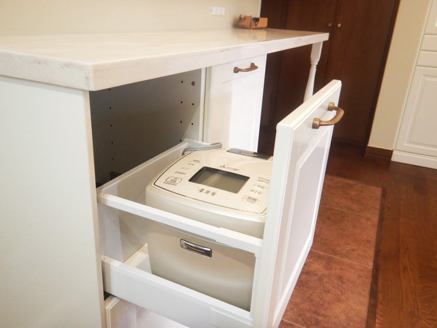 生活感のある炊飯器を、使用しない時は引き出しの中に収納。キャビネットの中にコンセントもお取り付けしました。 |